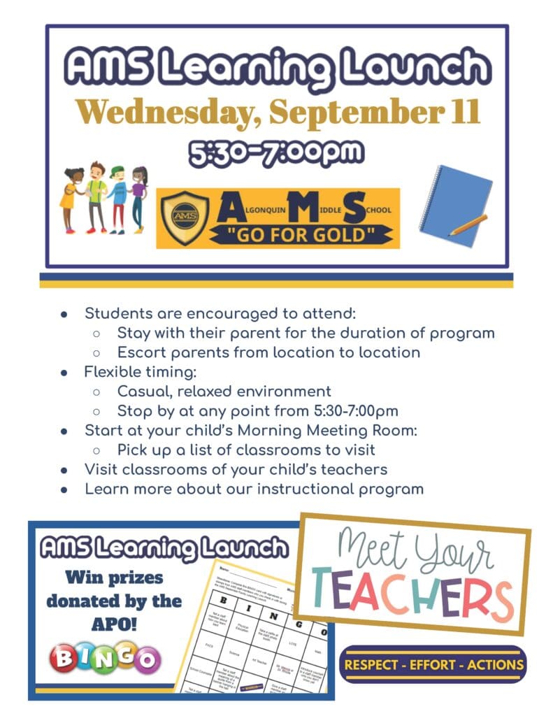 Algonquin Middle School is hosting “AMS Learning Launch” on Wednesday, Sept. 11, 2024 from 5:30-7 p.m. for AMS students and families! #AP_EveryStudentEveryDay