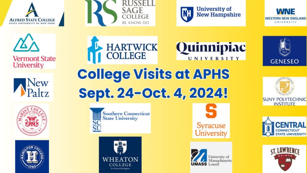 The following colleges are visiting APHS to meet with interested students. If you are interested, please pick up a permission form in the guidance office to meet with visiting reps. The form must be returned at least ONE DAY PRIOR to the visit. The form needs to be signed by a parent or guardian. The calendar of visiting college representatives are available in Naviance at the link below, as well.