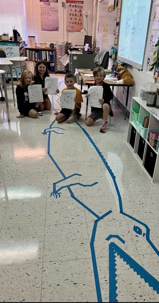 Mrs. Malenfant’s students at PES recently read and completed graphic organizers about a 20-foot crocodile. To help visualize the size of the crocodile, the class created a life-size image on the floor of the classroom. Students helped mark the length, and places where the feet and mouth would be. Way to go! #AP_EveryStudentEveryDay