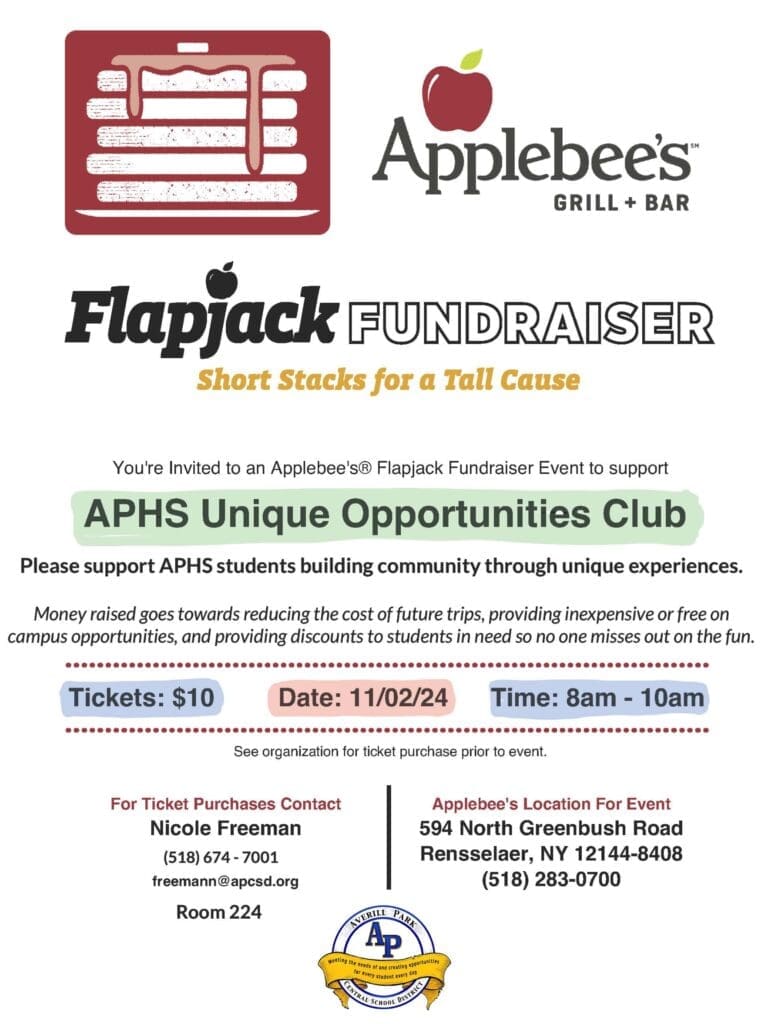 The Averill Park High School Unique Opportunities club will be hosting a pancake fundraiser at Applebee’s from 8 a.m. to 10 p.m. on Nov. 2, 2024! Tickets are $10.