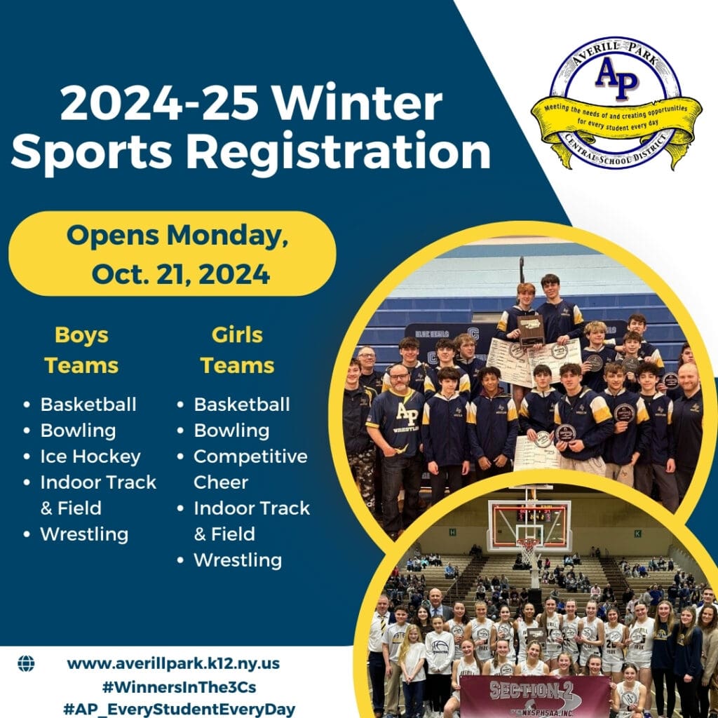 Registration for winter sports begins on Monday, October 21st. Please make sure all winter student-athletes have their parent/guardian complete the Winter 2024-25 Registratio n Form at https://www.familyid.com/ averill-park-central-school- district-athletic-department b y Sunday, November 3rd if they wish to play. Student-athletes must also have a current health physical (that is valid for the entire upcoming season) on file prior to the start of the season. Physicals are good for a period of 12 months. Student-athletes should have their physical performed by their primary care provider. If this is not possible please contact the APHS or AMS Health Office.