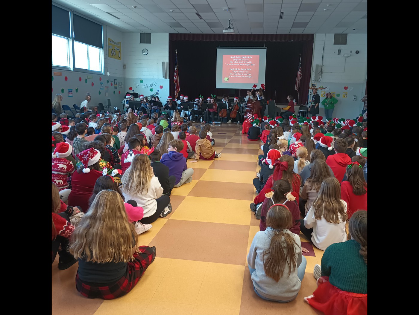 PES recently hosted its annual Jingle Mingle sing-a-long, bringing students together for a festive morning of music. Music teacher Mr. Van Buren led his first schoolwide sing-a-long after teaching holiday songs throughout December. The AMS orchestra, led by Mr. Kiefer, provided a beautiful accompaniment; joining PES students for the event.