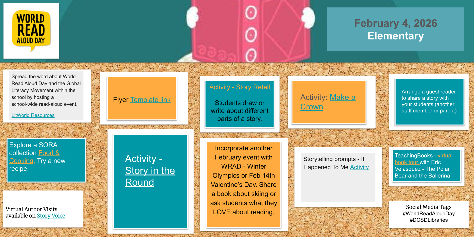 World Read Aloud Day Feb 3, 2026 You read aloud, they read aloud, someone online reads aloud, families read aloud — let’s all do it today! This Elementary World Read Aloud Choice Board contains links to reading activities for those interested.
