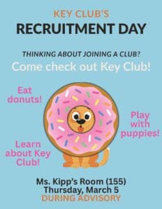 APHS Key Club is inviting students to learn more about the club during a Recruitment Day on Thursday, March 5 during Advisory. Students can stop by to enjoy donuts, spend time with therapy puppies, and hear how they can get involved with Key Club and its service projects.