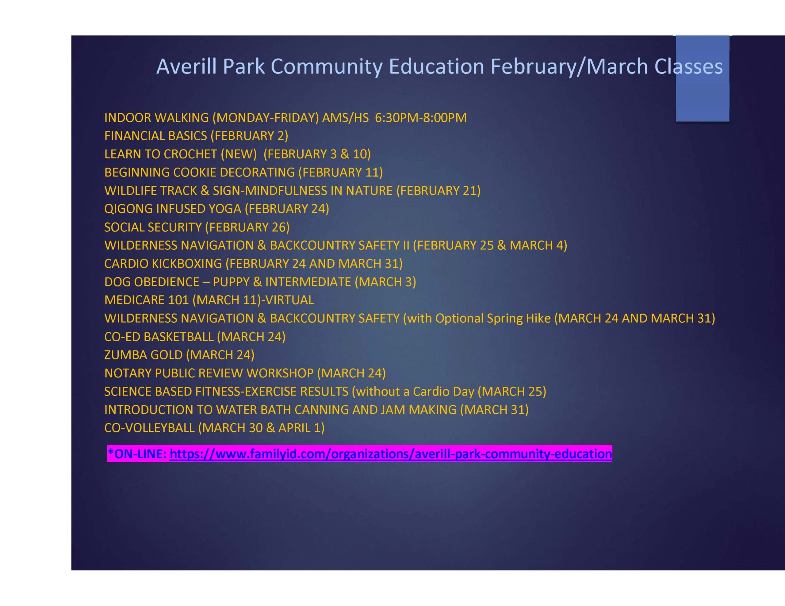 REGISTER AND PAY ONLINE: www.familyid.com/organizations/averill-park-community-education